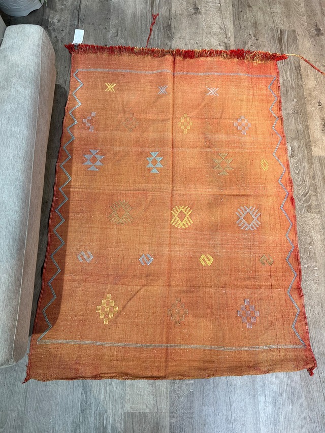 カクタスシルクラグ オレンジ 小 サイズ 136×96 サボテンの繊維から作られる「カクタスシルク(サブラシルク)」を贅沢に使用した、モロッコ伝統のラグです。 軽やかでしなやかな質感と、光の加減で変化する美しい光沢が魅力。お部屋に敷くだけで、上質で洗練された空間を演出します。 一点一点、モロッコの職人による手織りで仕上げられており、ハンドメイドならではの温かみと個性をお楽しみいただけます。 特徴 • サボテン繊維由来の「カクタスシルク」を使用 • モロッコ職人による手織りの一点もの • 軽くて丈夫、さらりとした肌触り • インテリアとしてはもちろん、壁掛けやベッドサイドにもおすすめ こんな方におすすめ • 自然素材のインテリアがお好きな方 • ナチュラル・ボヘミアン・北欧スタイルのお部屋に合わせたい方 • モロッコ雑貨やエスニックデザインがお好きな方 • サステナブルで長く使えるラグを探している方 ⸻ 注意書き • 本商品はモロッコで織られた ハンドメイドの一点もの です。サイズ・色味・織りの表情に個体差がございます。 • 天然素材(カクタスシルク)を使用しているため、繊維特有のネップ(小さな糸のかたまり)や染めむらが見られる場合があります。 • 水濡れには弱いため、洗濯機や大量の水洗いは避けてください。日常のお手入れは乾いた布や掃除機での軽い掃除がおすすめです。ドライクリーニング推奨 • 撮影環境やお使いのモニターにより、実際の色合いと異なって見える場合があります。
