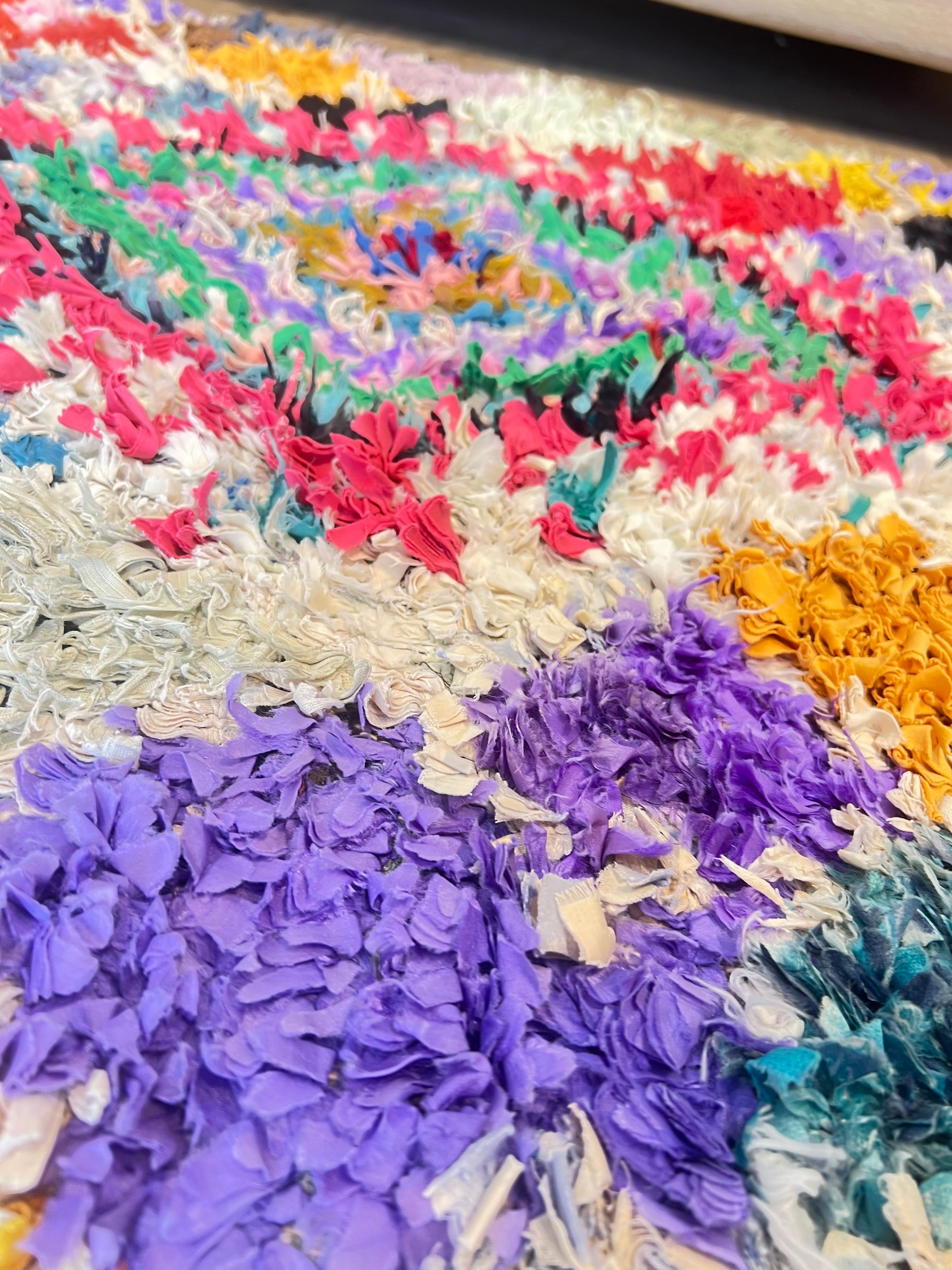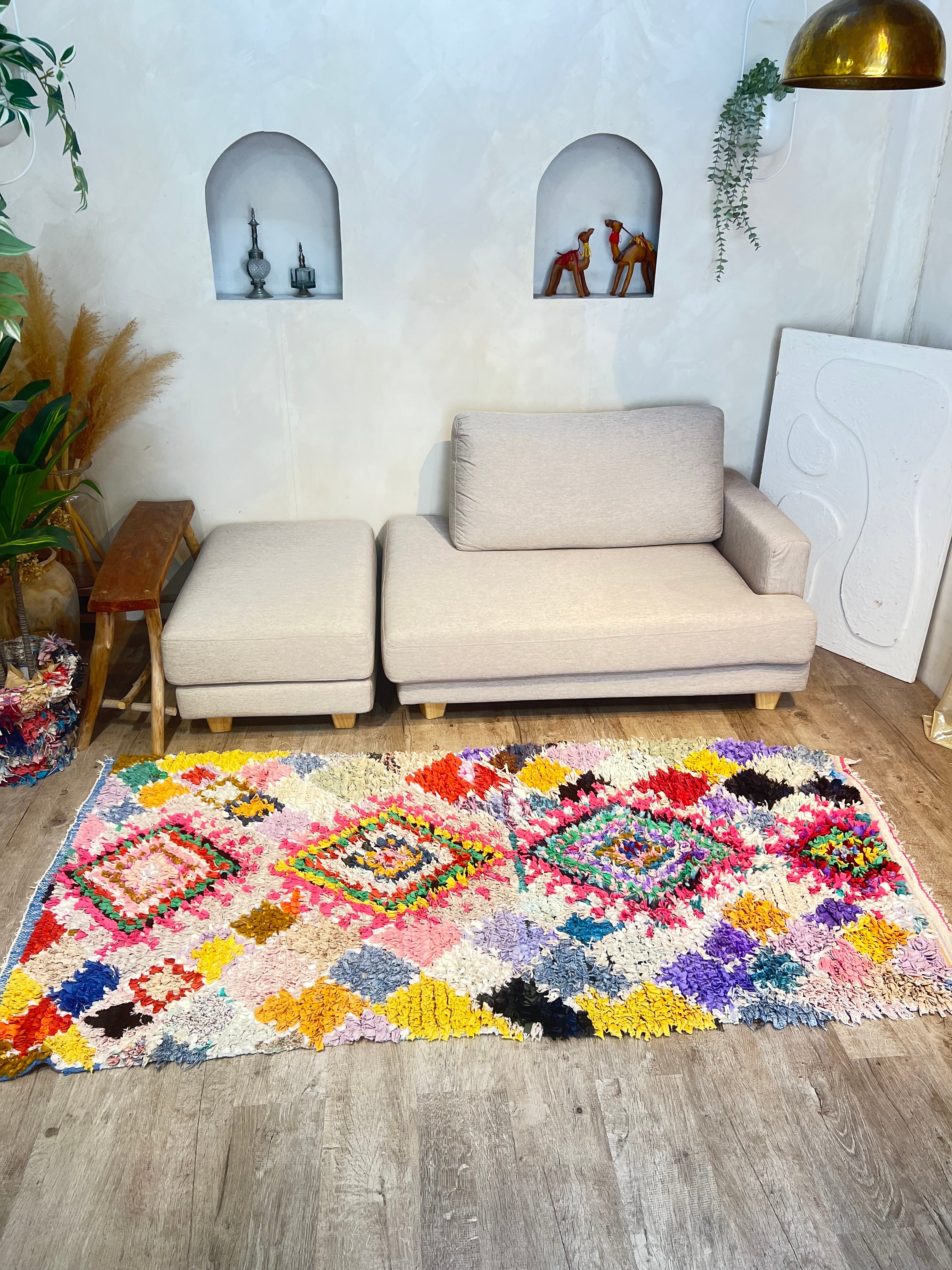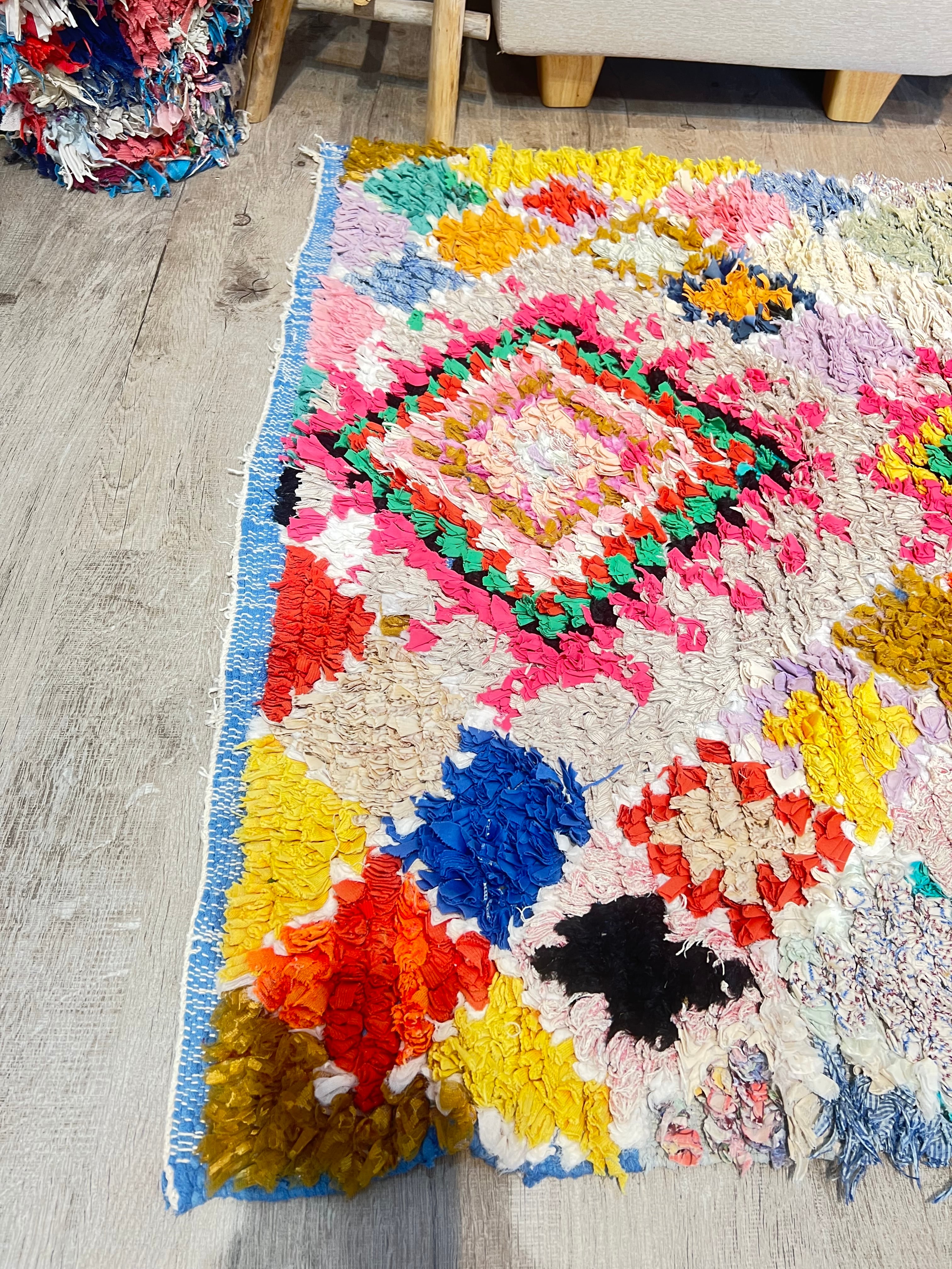 モロッコのヴィンテージボシャルウィットラグ カラフルな 一点もののモロッコラグです。