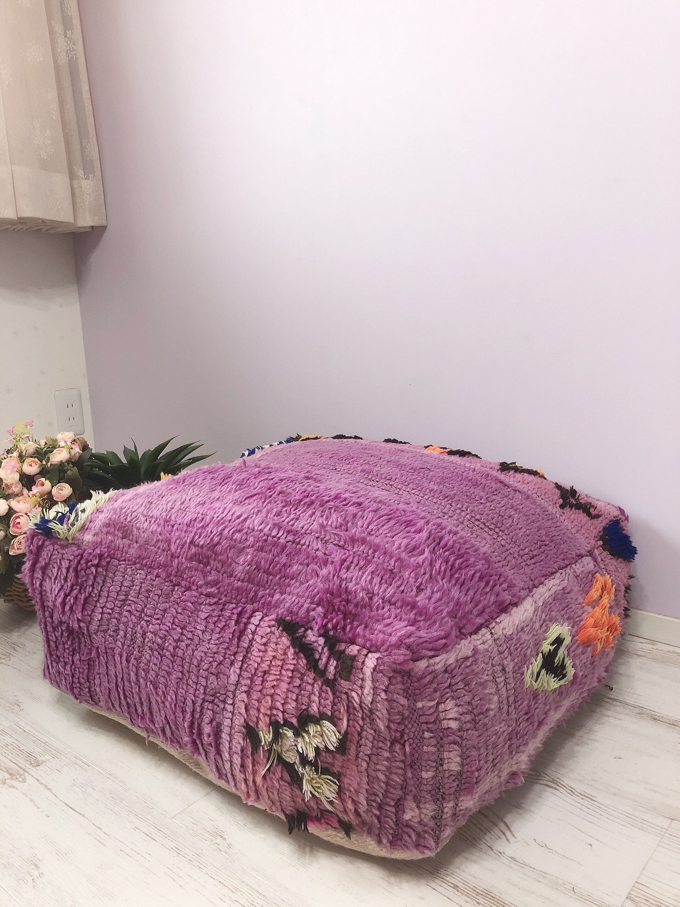 モロッコの敷物を作るため女性達が手織りで制作してくれます。敷物をリメイクして作られたプフ、クッションカバーは