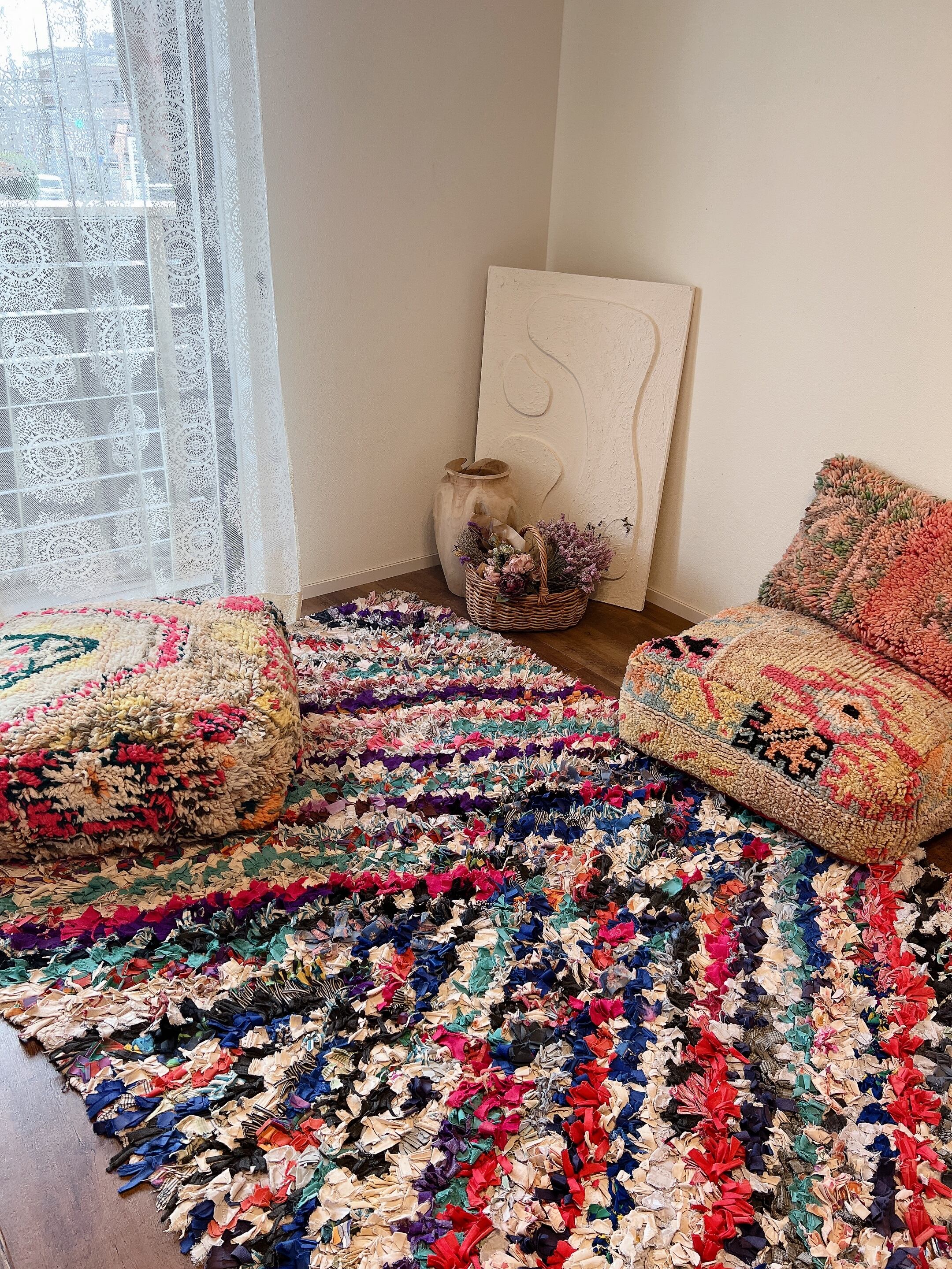 こんにちは!カラフルなおしゃれなお部屋にぴったりのボシャルウィットラグをご紹介します。古布を贅沢に使用し、職人の手で一点一点丁寧に作られたこのラグは、まるでアート作品のような美しさがあります。カラフルな色合いがお部屋を一気に華やかに演出し、インテリアのアクセントになること間違いなし!一生大切にしたい一点もの。