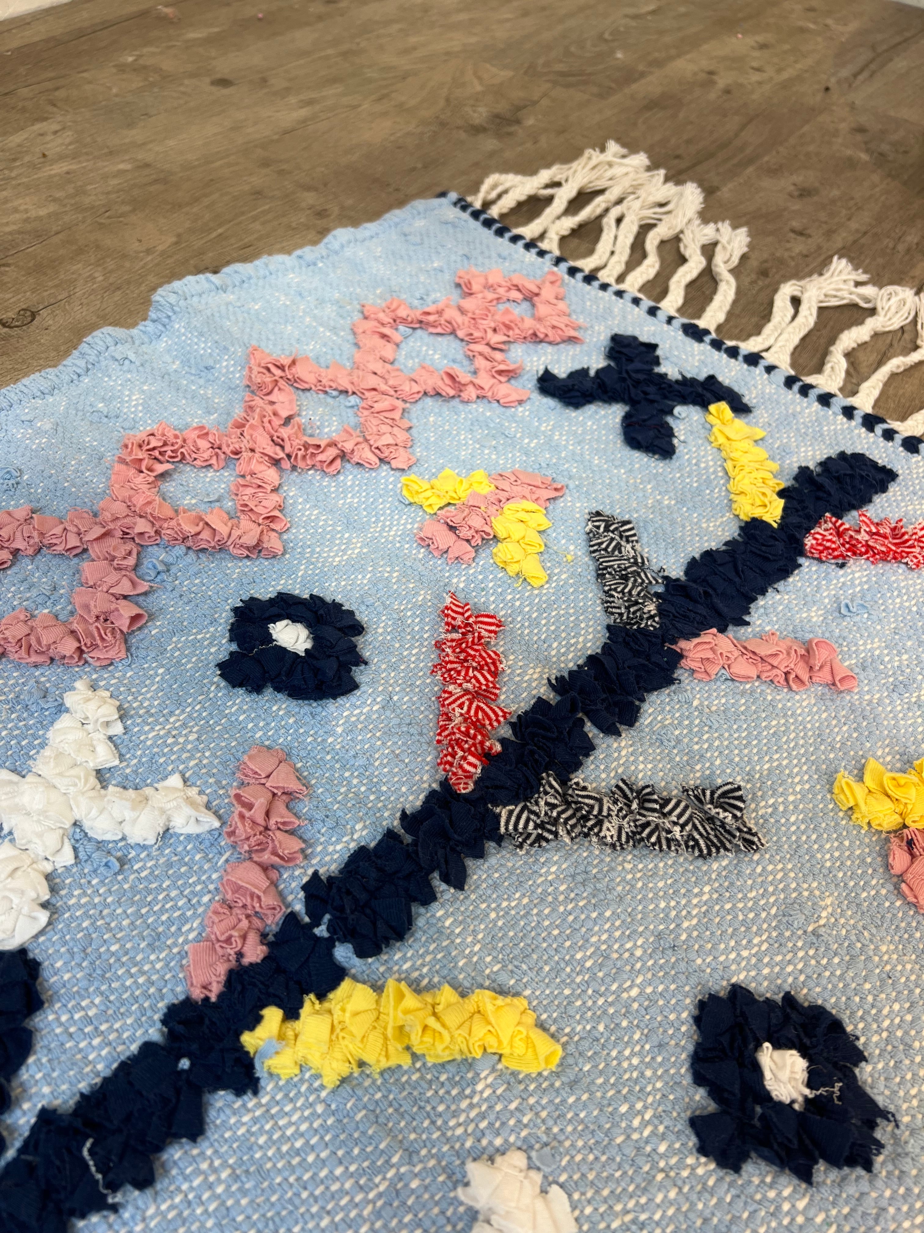 モロッコのアジラルで作られた、お花の模様がかわいいミニラグです。綿100%なので、肌触りも抜群でさらっとした感触が気持ち良いです。玄関先やリビング、寝室などのお部屋に敷いて、一気におしゃれ度がアップします!