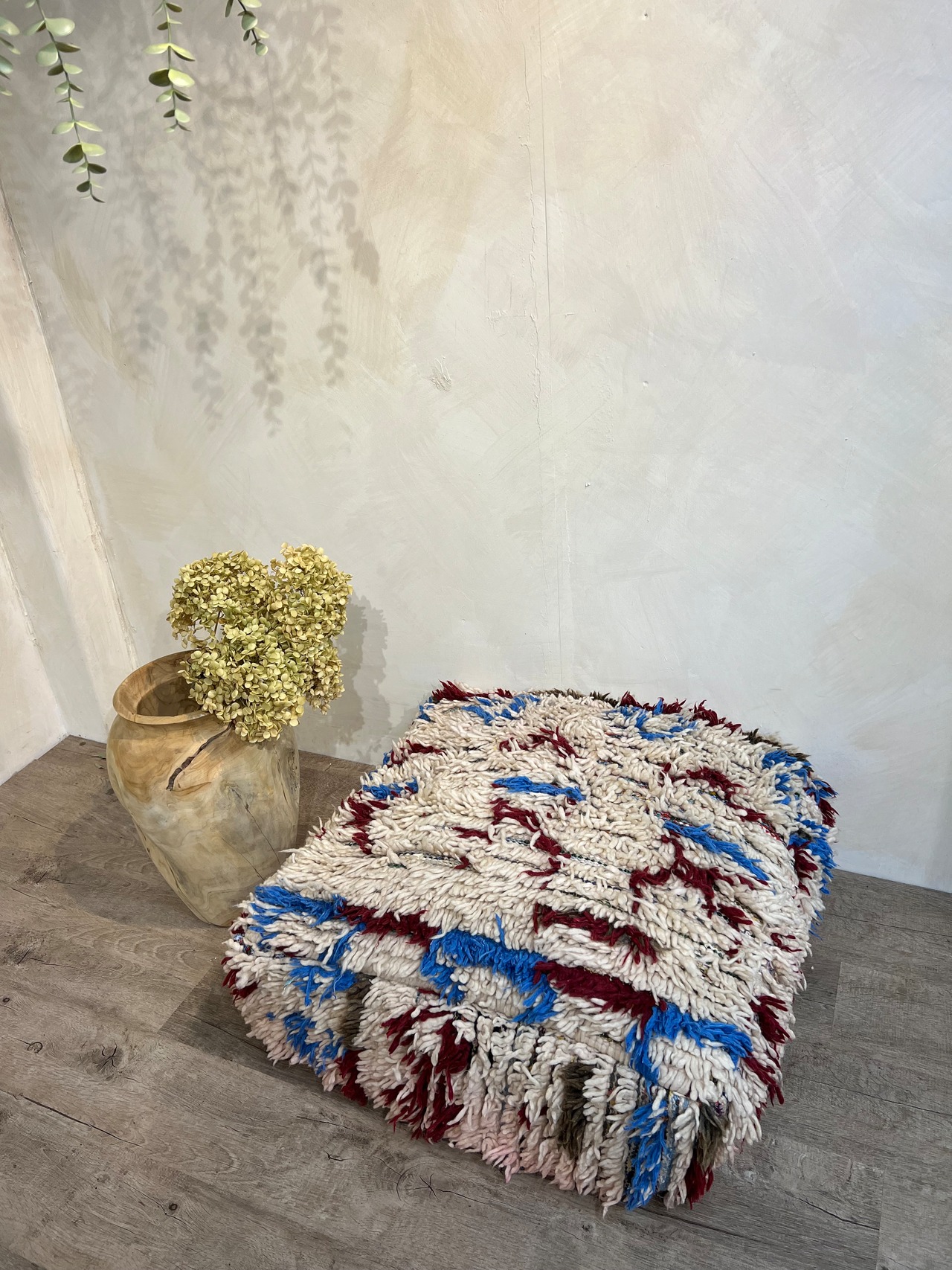 こちらの「白ベースのモロッコラグリメイクプフ 0804」は、シンプルでありながら洗練されたデザインが魅力的なアイテムです。柔らかいウールを使用し、職人の手によって一つ一つ丁寧に作り上げられています。白を基調とした色合いが、どんなインテリアにも素晴らしく溶け込み、清潔感とやさしさを演出します。